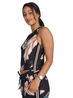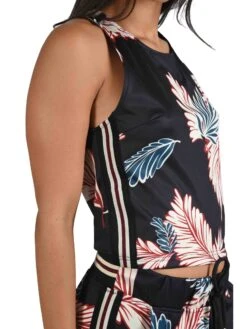 Ce débardeur crop top à motif feuilles exotiques possède des détails bandes bicolores sur les côtés et également au niveau des épaules.