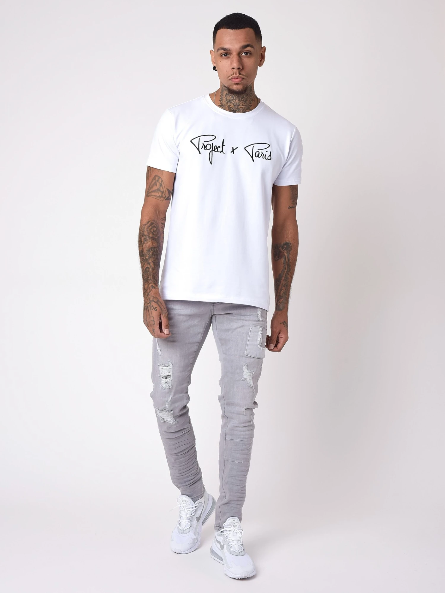 - Le mannequin mesure 180cm pour 75kg et porte du 32